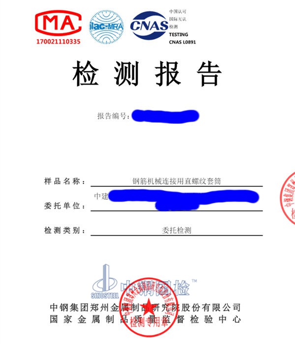 檢測單位:中鋼國檢(國家金屬制品質(zhì)量監(jiān)督檢驗中心),有CMA、CNAS、橋隧、鐵路、公路檢測資質(zhì),全國各省市有辦事處,部分城市有實驗室,鋼筋機械連接用直螺紋套筒檢測報告及其他工程材料檢測都可咨詢工程師。