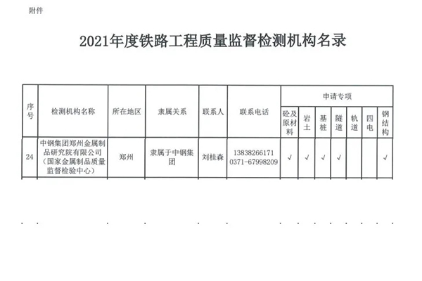 近日,鐵路集團有限公司工程質(zhì)量監(jiān)督管理局發(fā)布了《關(guān)于公布2021年度鐵路工程質(zhì)量監(jiān)督檢測機構(gòu)名錄的通知》,并將滿足合格條件的91家監(jiān)督檢測機構(gòu)進行公示,中鋼集團鄭州金屬制品研究院(金屬制品質(zhì)量監(jiān)督檢驗中心)再次上榜入圍,這標志著中鋼國檢的工程檢測能力得到了高度認可。